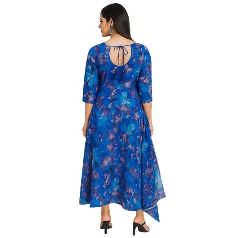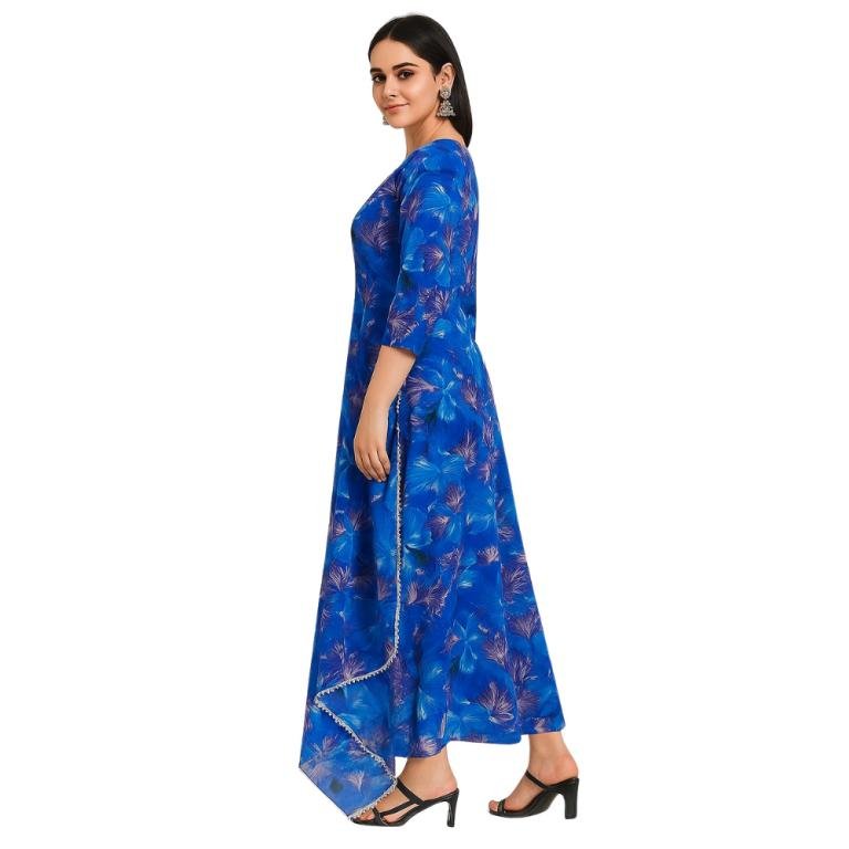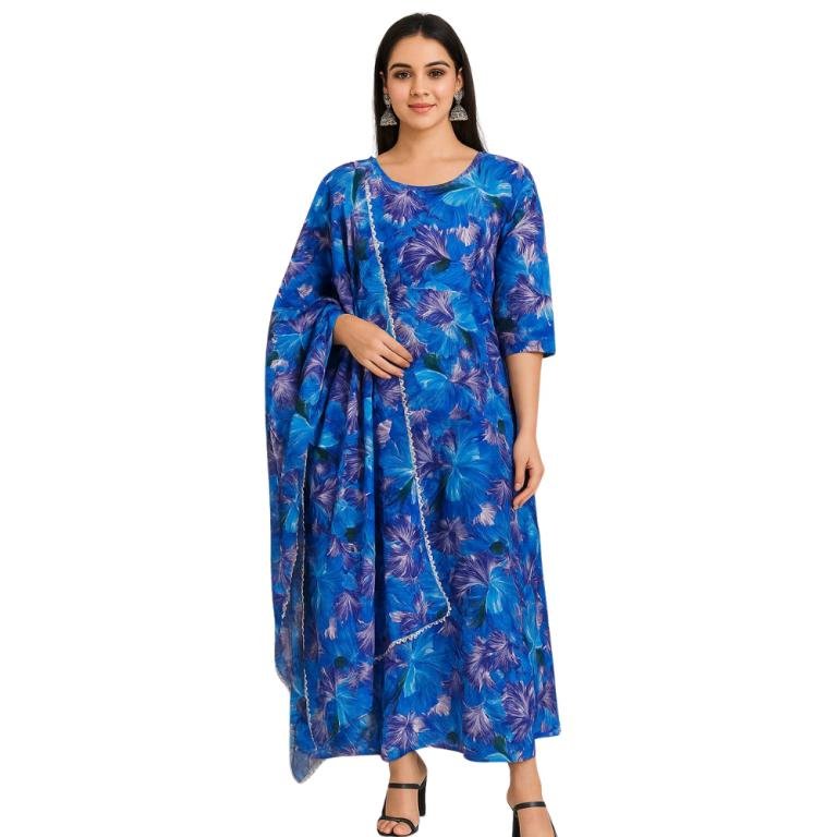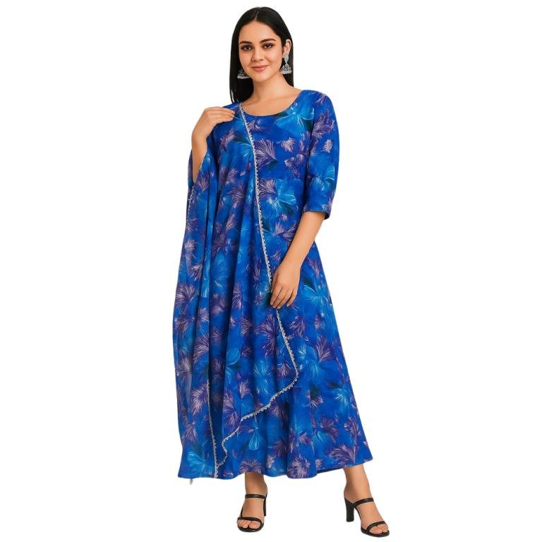 Stylish blue printed gown frock paired with a matching dupatta, featuring elegant patterns and a flowy silhouette—perfect for festive occasions and graceful daywear.