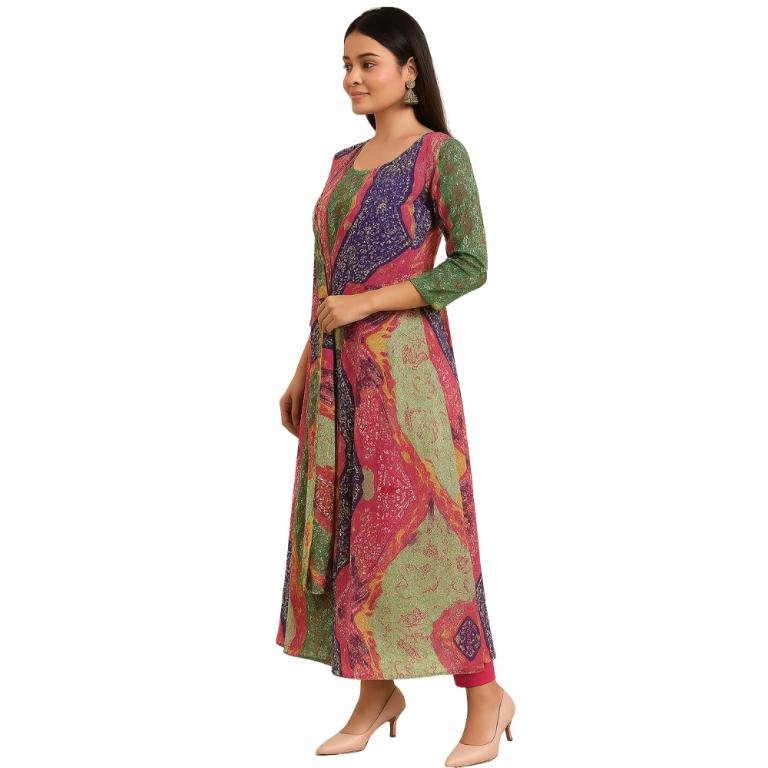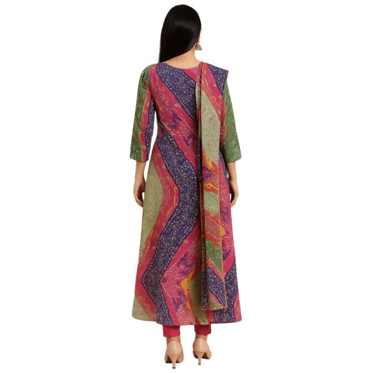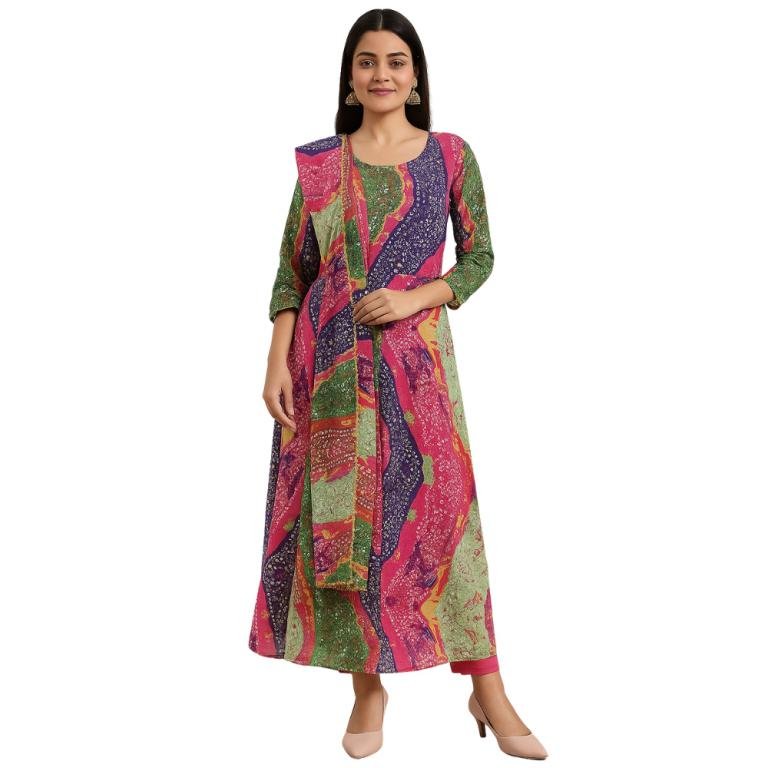 Vibrant multicolored Bandhej printed Anarkali frock dress, blending traditional charm with a graceful silhouette – perfect for festive flair and everyday elegance.