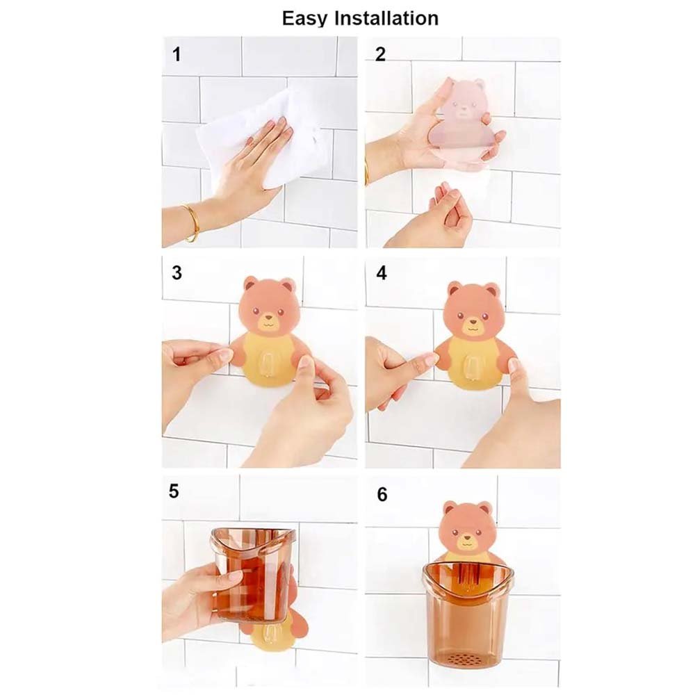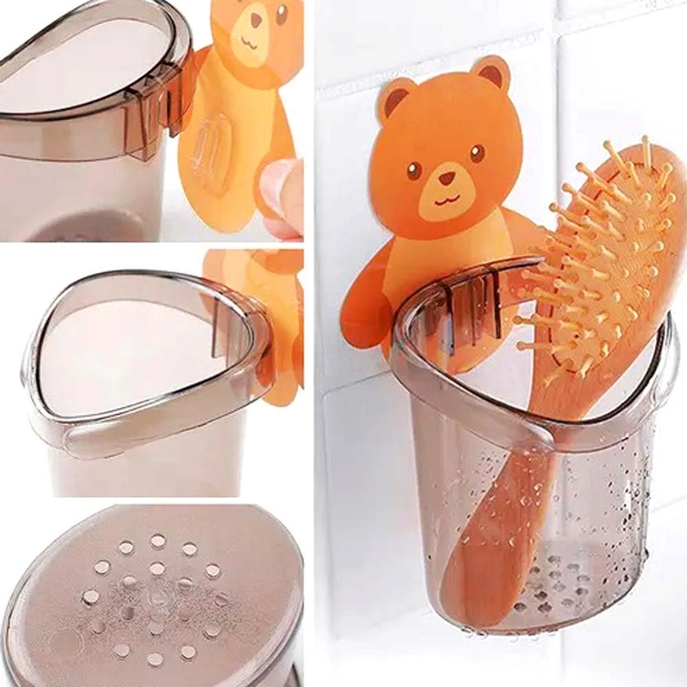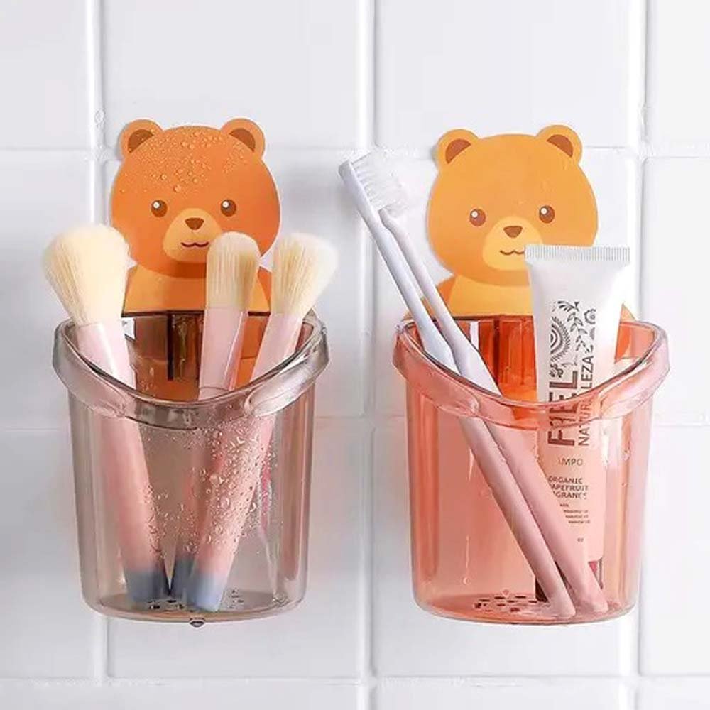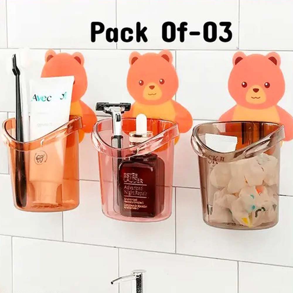 Spinfluencs Toothbrush Holder (Set of 3 Pcs) Plastic Stand for Toothpaste, Comb, Brush, Cream, Lotion Kids Bathroom Cup Drain Waterproof Self-Adhesive, Teddy Bear
