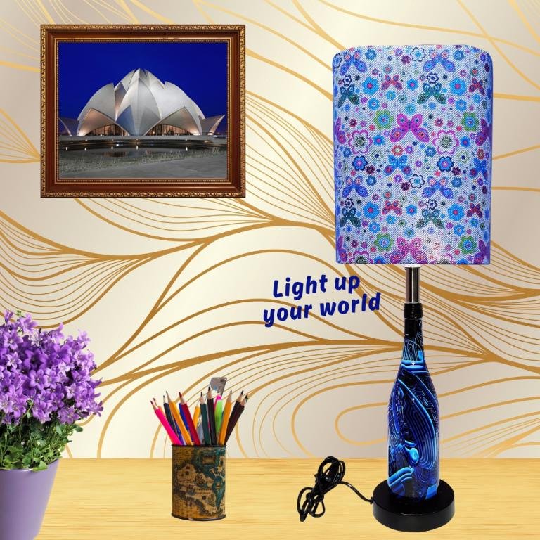 elegance. With its recycled wine bottle base and serene light blue shade, it