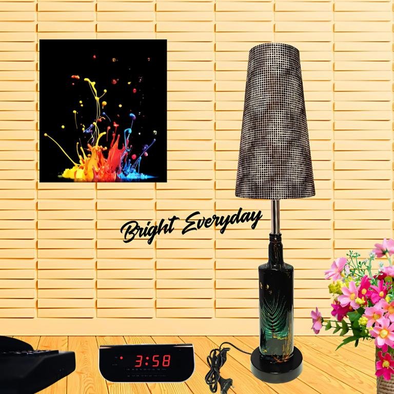 lamp features a sleek black wine bottle adorned with a sophisticated green and