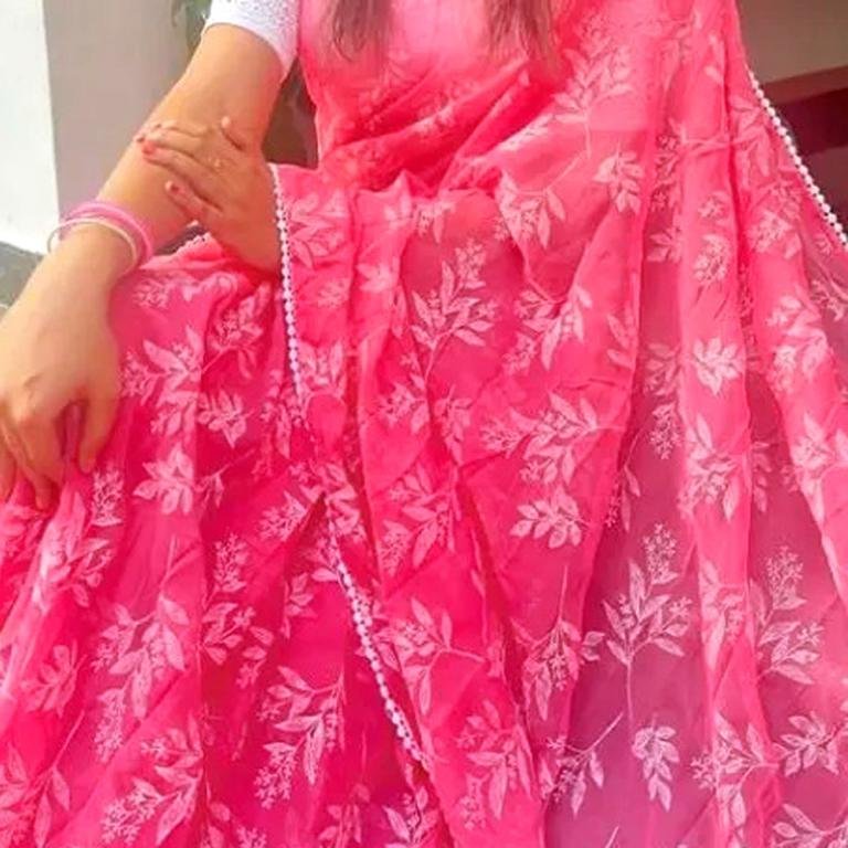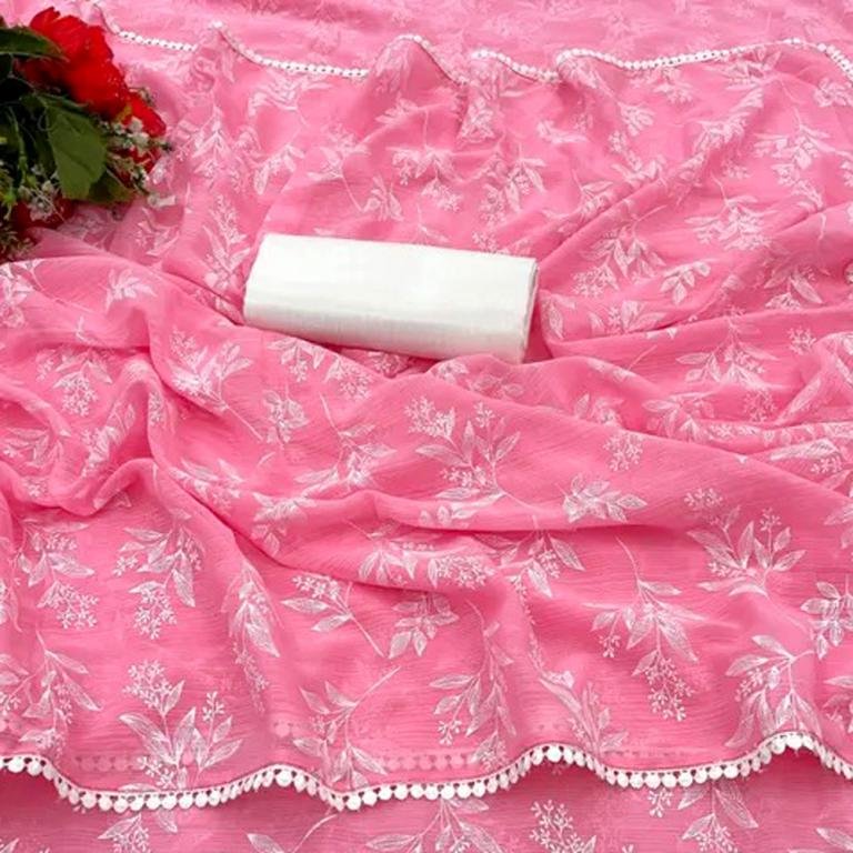 Bhagalpuri Chiffon Pink Lace border Saree With Blouse