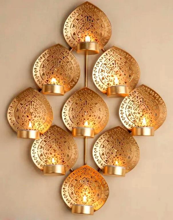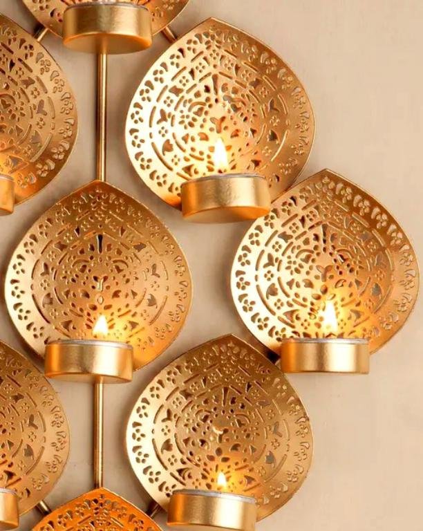 Gold Leaf Wall-Mounted Candle Holder With Intricate Cut-Out Design. Material : Metal Type : Tealight